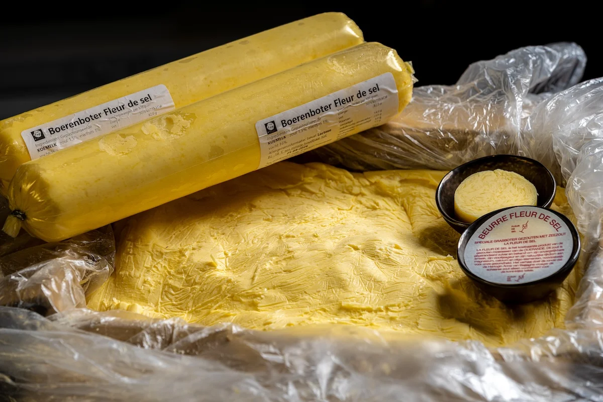Deze heerlijke ambachtelijke boerenboter uit de polders van de Krimpenerwaard wordt gemaakt van volle, verse melk. De boter wordt in tegenstelling tot fabrieksboter ouderwets gekarnd. Deze boerenboter is authentiek en vol van smaak. Samen met het Fleur de Sel zeezout, maakt deze boter tot een hoogwaardig product.