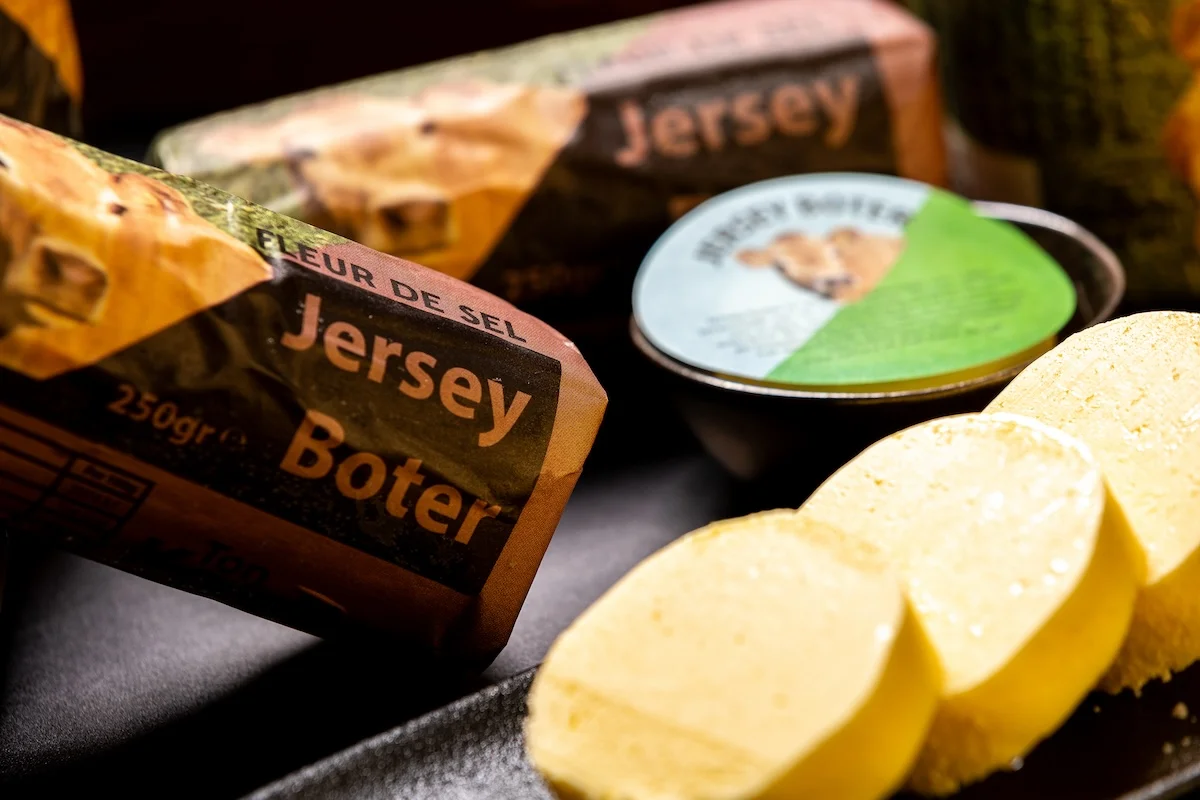 Onze Jersey boter is uitsluitend gemaakt van 100% Jerseymelk van de raskoe Jersey. Jerseymelk heeft een andere samenstelling van vet en eiwit, waardoor de boter nog romiger is, rijk aan smaak en boordevol vitaminen. Door het klimaat op het eiland Jersey heeft de boter een natuurlijke bijzondere gele kleur. Samen met het Fleur de Sel zout, maakt deze boter tot een hoogwaardig product.
